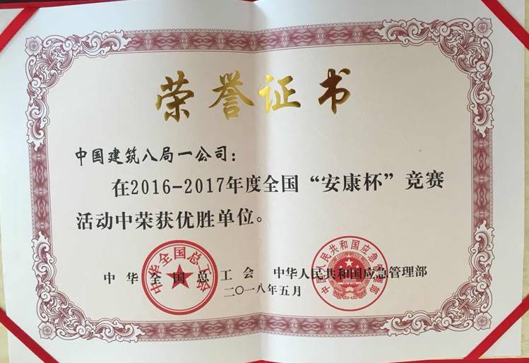 2018年6月12日,中華全國總工會和中華人民共和國應(yīng)急管理部在北京召開全國“安康杯”競賽活動表彰暨經(jīng)驗交流電視電話會議,一公司被授予全國“安康杯”競賽優(yōu)勝單位榮譽,公司副總經(jīng)理寧文忠、工會工作部負(fù)責(zé)人方健代表公司現(xiàn)場接受了表彰。