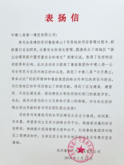 近日,蘇地2016-WG-57號西地塊項目收到魯能廣宇置業(yè)有限公司對項目部的表揚信,信中對公司工程施工給予了高度評價及肯定,并對項目團隊的團結(jié)協(xié)作提出表揚。