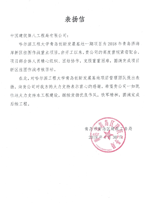 2月14日,哈爾濱工程大學青島創(chuàng)新發(fā)展基地一期項目收到來自青島市黃島區(qū)建筑工務局的表揚信。