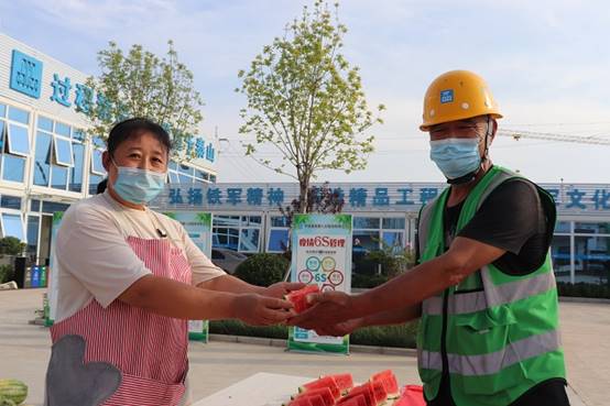 為進(jìn)一步幫助當(dāng)?shù)毓限r(nóng)拓寬銷路,項(xiàng)目工會(huì)組織開展“防疫+防暑”暖心行動(dòng),為一線參建者送上一份夏日清涼,并鼓勵(lì)大家自主購(gòu)買。7月6日,項(xiàng)目部設(shè)置“愛心餐桌”,工作人員將解暑飲品和西瓜送到即將進(jìn)場(chǎng)施工的建筑工人手中。