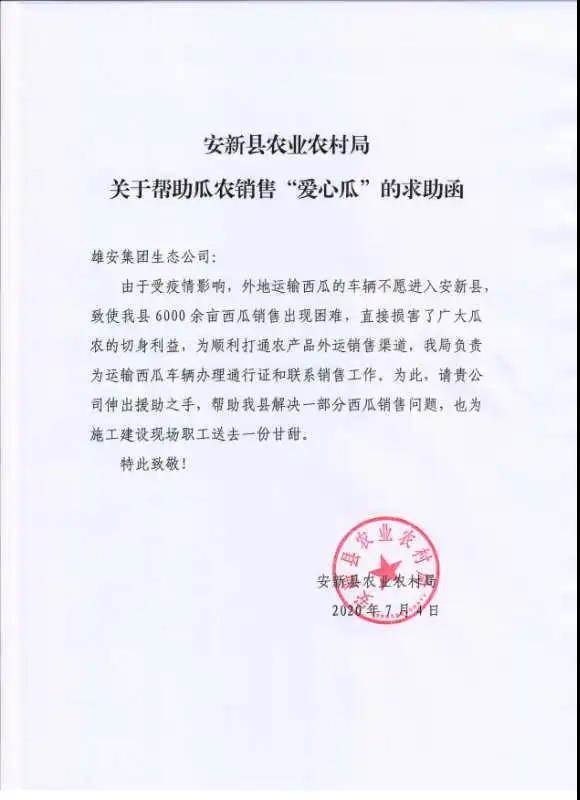7月4日,中國(guó)雄安集團(tuán)生態(tài)建設(shè)投資有限公司收到安新縣農(nóng)業(yè)農(nóng)村局發(fā)來的求助函。公司雄安站樞紐片區(qū)市政道路、綜合管廊、排水管網(wǎng)系統(tǒng)(一期)工程一標(biāo)段項(xiàng)目部積極響應(yīng)業(yè)主單位號(hào)召,當(dāng)即選購(gòu)滯銷西瓜約60000斤,為當(dāng)?shù)毓限r(nóng)解燃眉之急。