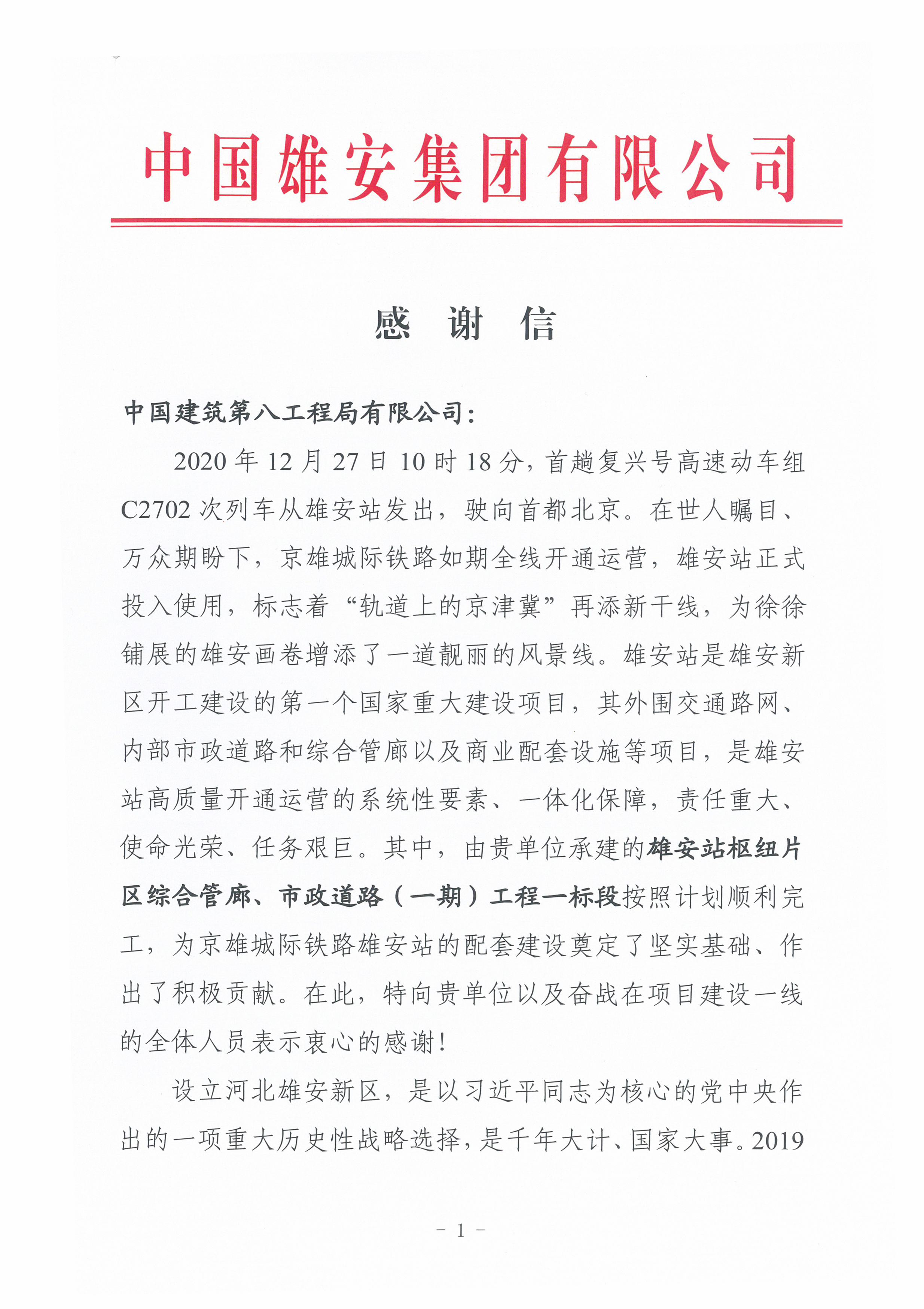 近日,中建八一承建的雄安站樞紐片區(qū)市政道路、綜合管廊、排水管網(wǎng)系統(tǒng)(一期)工程一標(biāo)段項(xiàng)目,收到中國(guó)雄安集團(tuán)發(fā)來(lái)的兩封感謝信。信中對(duì)中建集團(tuán)、中建八局攻堅(jiān)克難、完美履約,圓滿完成京雄城際鐵路“保開通段”任務(wù),表示衷心感謝。