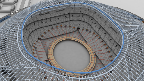項目應(yīng)用“領(lǐng)眸”智慧建造系統(tǒng),實現(xiàn)多專業(yè)超前穿插施工和復(fù)雜鋼結(jié)構(gòu)變形精準(zhǔn)預(yù)控,研發(fā)國內(nèi)首例CFRP高性能索輪輻式索桁架體系,與重慶大學(xué)周緒紅院士團隊合作,攻克大跨度屋蓋鋼結(jié)構(gòu)體系難題,打造世界最大的單層足球場屋頂覆膜結(jié)構(gòu)、透光率世界最高、抗拉強度國內(nèi)最大。