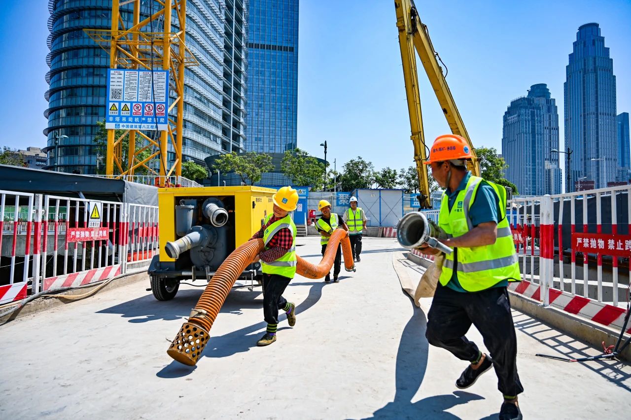 演練模擬施工過程中遭遇大風(fēng)強(qiáng)降雨,現(xiàn)場發(fā)生基坑雨水倒灌、基坑地連墻滲漏、人員高處跌落等突發(fā)情況,危及施工人員生命安全。項(xiàng)目快速啟動(dòng)應(yīng)急預(yù)案并向上級(jí)請(qǐng)求支援,各應(yīng)急小組成員緊急集合,有序開展防汛救災(zāi)工作,外部多支救援隊(duì)奔赴現(xiàn)場實(shí)施救援,共計(jì)投入應(yīng)急處置人員45人次,出動(dòng)應(yīng)急車輛2臺(tái)、救援機(jī)械6臺(tái)、應(yīng)急裝備260余臺(tái)(套),成功轉(zhuǎn)移現(xiàn)場受困人員。開啟基坑天幕系統(tǒng),使用沙袋加高擋水臺(tái)阻水圍堰,封堵地連墻滲漏、進(jìn)行基坑緊急排水,并將傷者及時(shí)送至定點(diǎn)醫(yī)院,險(xiǎn)情得以控制,演練達(dá)到預(yù)期效果。