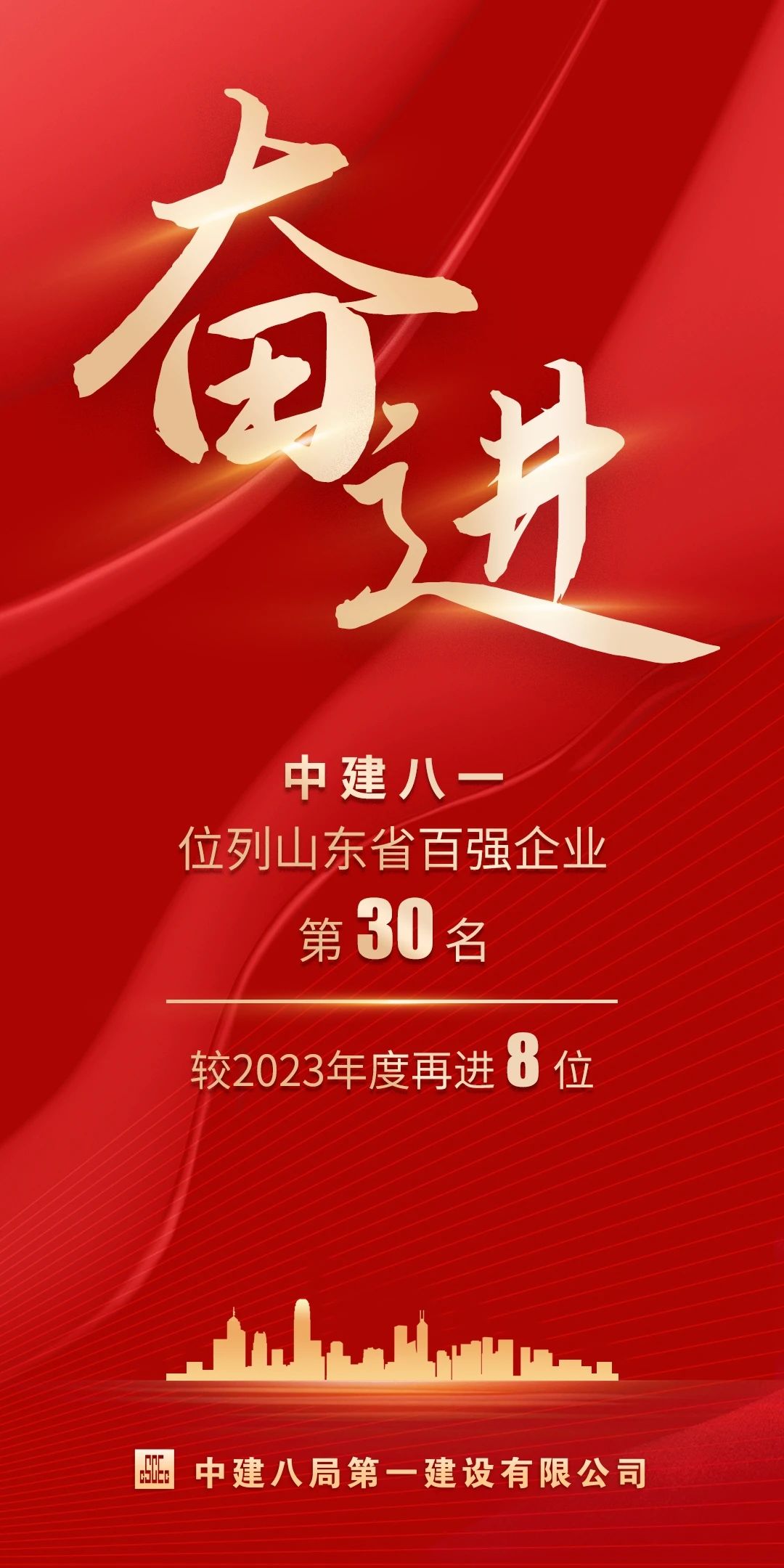 近日,山東省工業(yè)和信息化廳、省企業(yè)聯(lián)合會聯(lián)合公布2024山東企業(yè)100強名單,中建八局一公司拼搏奮進、持續(xù)進位,位列綜合百強企業(yè)第30名,較上屆排名再進8位,彰顯高質(zhì)量發(fā)展的澎湃動力。