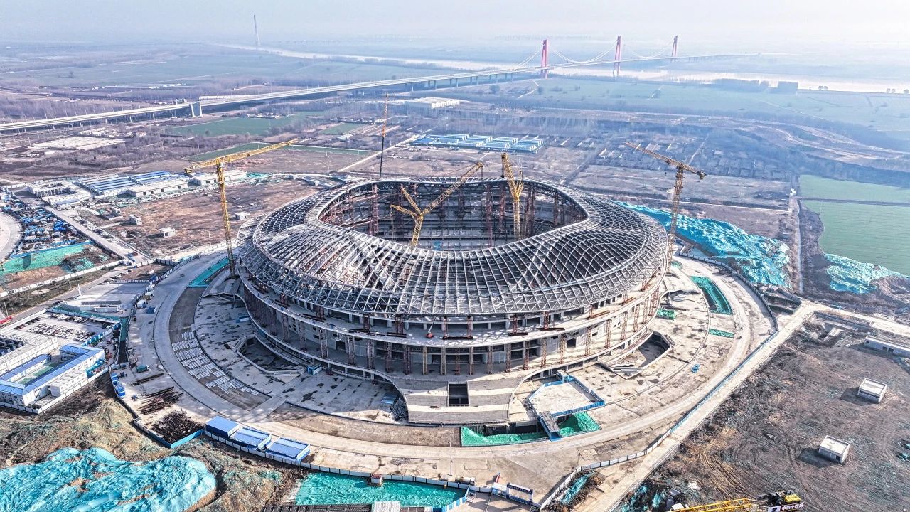 項(xiàng)目采用國(guó)際足聯(lián)FIFA最新標(biāo)準(zhǔn),將多種高新科技融入建造當(dāng)中,是世界首個(gè)平面單層膜輪輻式索膜結(jié)構(gòu)體系、國(guó)內(nèi)首例專業(yè)足球場(chǎng)大規(guī)模應(yīng)用高透光率PTFE網(wǎng)格膜材料,建成后將以足球?yàn)槠瘘c(diǎn)、黃河為紐帶,進(jìn)一步提升體育相關(guān)產(chǎn)業(yè)能級(jí),助力濟(jì)南由“泉城時(shí)代”邁進(jìn)“黃河時(shí)代”。目前,項(xiàng)目已完成鋼桁架主體結(jié)構(gòu)合龍,下一步將進(jìn)行裝飾裝修施工。