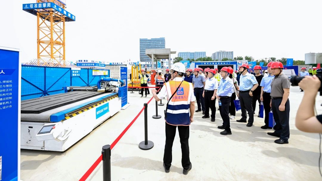 期間,與會人員共同觀摩項目智慧建造展廳,對中建八局一公司抹灰機(jī)器人、便攜式管道焊接機(jī)器人、全自動智能套絲機(jī)器人、四輪激光地面整平機(jī)器人等智慧建造產(chǎn)品予以肯定。