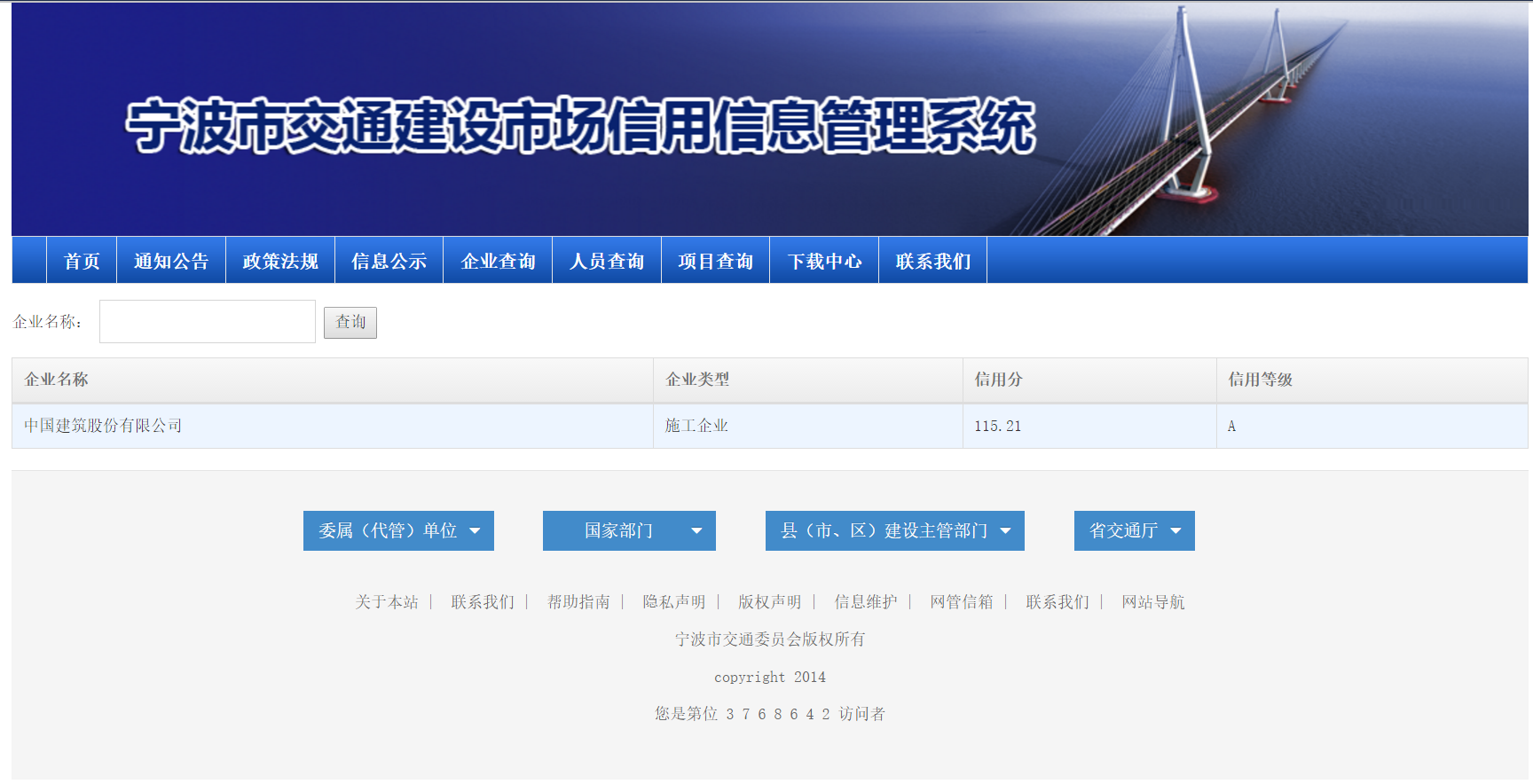 2020年中國建筑股份有限公司在寧波交通建設(shè)信用信息管理系統(tǒng)中信用分為115.