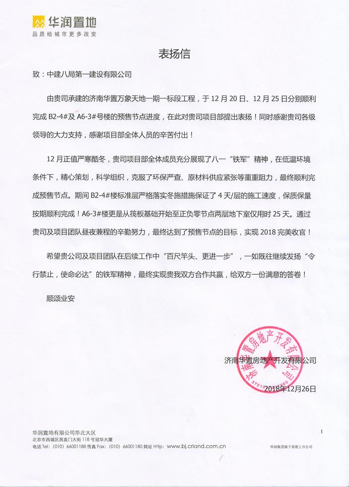 近日,濟南華置萬象天地項目一期一標段總承包工程收到濟南華置房地產開發(fā)有限公司發(fā)來的表揚信,信中對一公司、濟南公司各級領導的大力支持及項目部管理人員在搶工期間攻堅克難和不畏勞苦的精神提出了表揚,并對項目管理團隊給予了充分肯定。