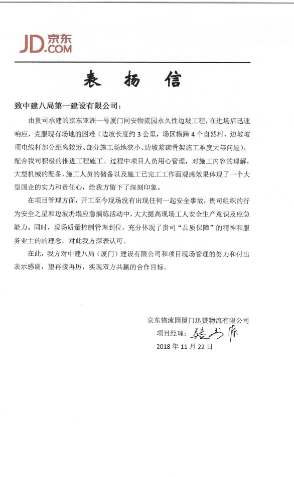 近日,廈門京東物流園項目部收到了業(yè)主發(fā)來的表揚信。 在信中,業(yè)主對項目團隊攻堅場地困難,過程質(zhì)量管控以及廈門公司高度重視給予了肯定。