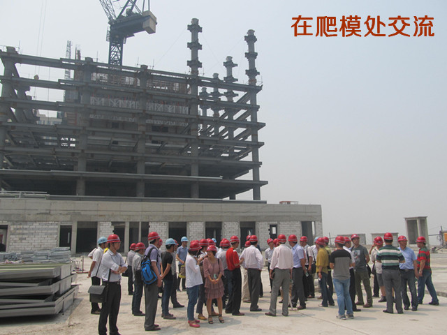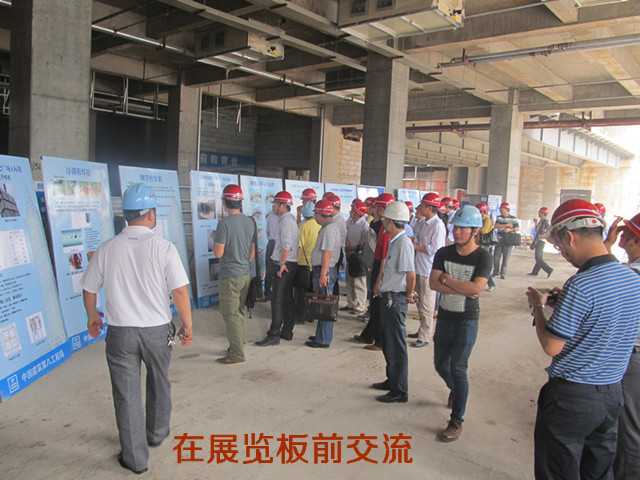 袁董事長一行在相關人員帶領下,深入施工現場觀摩指導。過程中大家就大體積混凝土澆筑、超大噸位動臂式內爬塔吊爬升及其大跨度鋼梁、超高層混凝土超高壓泵送、鋼管柱高拋自密實混凝土、集成式電動爬升模板、高速施工電梯等施工技術進行了深入的交流。大家對施工現場的標準化防護設施、安全文明施工給予了高度評價。