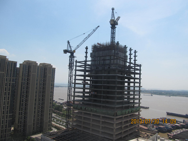 蕪湖僑鴻國際工程結(jié)構(gòu)高度273.15米,建筑高度318米。項(xiàng)目自開工以來,項(xiàng)目部先后完成了大體積混凝土澆筑、超大噸位動(dòng)臂式內(nèi)爬塔吊爬升及大跨度支撐鋼梁安裝、大跨度勁性預(yù)應(yīng)力梁施工、超高層混凝土泵送、鋼管柱高拋?zhàn)悦軐?shí)混凝土、集成式電動(dòng)爬升模板、高速施工電梯安裝等一系列施工難題,2013年7月30日塔樓成功突破100米大關(guān),達(dá)到103.01米,完成階段性施工任務(wù)。(劉子偉)