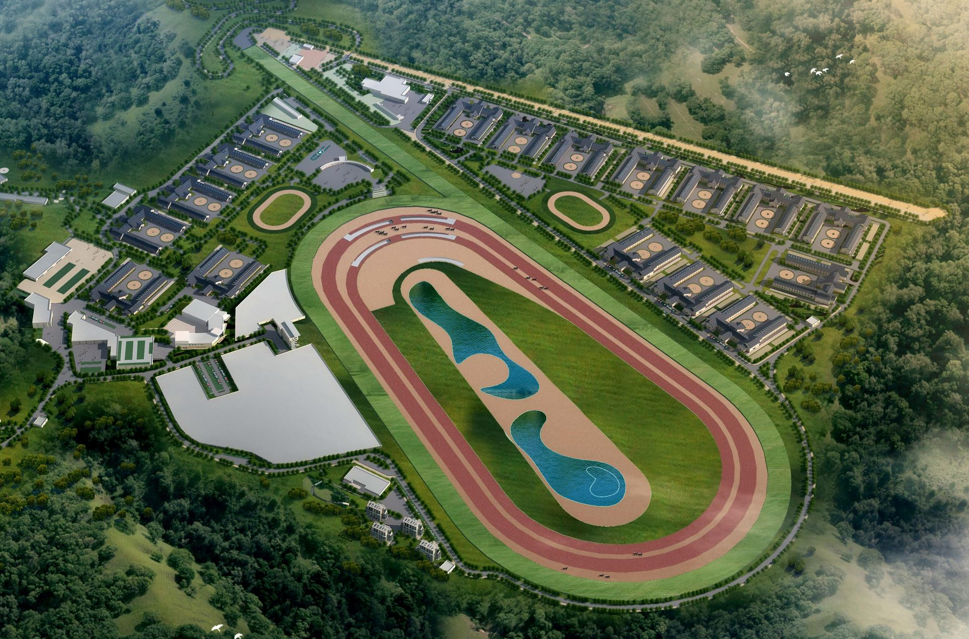 廣州香港馬會馬匹運動訓練場總承包工程,房建部分由馬廄、馬匹醫(yī)院等36個單體組成,市政部分主要由T1、T2、T3跑道及6.5km道路組成;園林部分主要為人工湖、室外園林組成。