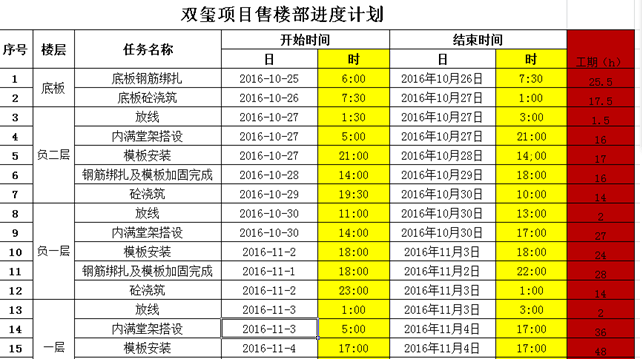 售樓部主體施工期間,項(xiàng)目部編制了詳細(xì)的施工進(jìn)度計(jì)劃,計(jì)劃精確到小時(shí),24小時(shí)兩班輪流不間斷施工,保證了地下室兩層和地上一層主體結(jié)構(gòu)在20天內(nèi)的完成。