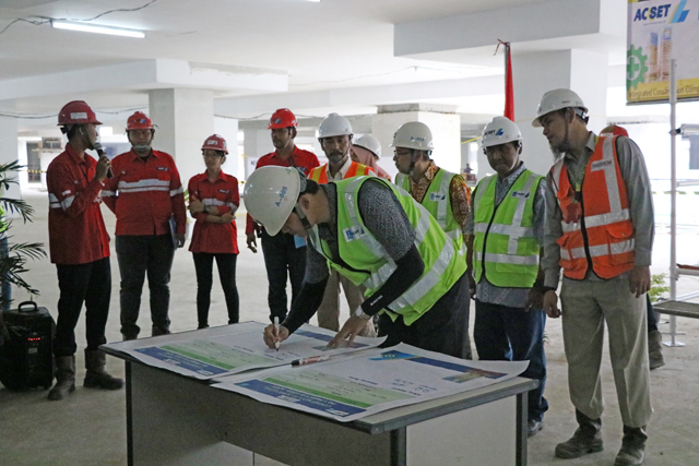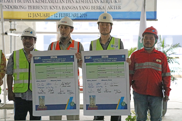 早上七時三十分,活動正式開始,主持人致辭并宣讀了本年度安全生產(chǎn)月活動主題及啟動儀式的主要流程?;顒觾x式上,總監(jiān)理工程師Dedi宣讀了印尼勞工部關(guān)于建筑行業(yè)安全生產(chǎn)的相關(guān)法律和法規(guī),安全部經(jīng)理Iswanto就2017年項目安全生產(chǎn)活動進(jìn)行總結(jié)報告,詳細(xì)回顧了過去一年里項目在安全管理方面取得的一系列成績,并就2018年安全管理目標(biāo)進(jìn)行了展望?;顒舆€對項目2018年度安全生產(chǎn)活動進(jìn)行了詳細(xì)部署,項目經(jīng)理劉嘉東等主要管理人員簽訂了目標(biāo)責(zé)任狀。