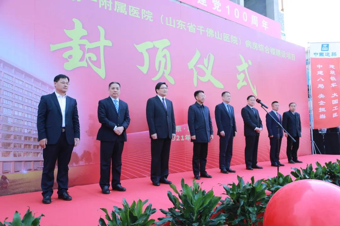 山東第一醫(yī)科大學(xué)(山東省醫(yī)學(xué)科學(xué)院)黨委委員、副校長(zhǎng)姚慶強(qiáng)出席儀式,并宣布項(xiàng)目封頂。千佛山醫(yī)院黨委書(shū)記王一兵,黨委副書(shū)記、院長(zhǎng)胡三元,黨委副書(shū)記劉亞民,總會(huì)計(jì)師張永征,副院長(zhǎng)兼工會(huì)主席劉效良,副院長(zhǎng)許翠萍;山東普華項(xiàng)目管理有限公司總經(jīng)理路公高;中建八局一公司副總經(jīng)理劉明等出席儀式。