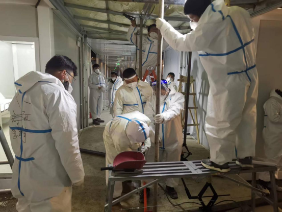 3月18日,在接到吉林市高新南區(qū)隔離方艙建設(shè)任務(wù)后,公司副總經(jīng)理寧文忠擔(dān)任總指揮,華北、安裝、裝飾公司迅速部署,僅用5個小時完成人員調(diào)配、核酸檢測和后備物資的集結(jié)。首發(fā)隊伍于當(dāng)晚六點出發(fā),星夜兼程、跨越千里奔赴吉林。
