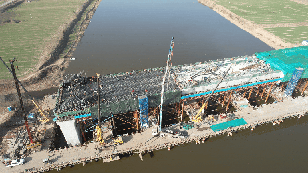 本次系桿拱橋合龍為項目首次跨越徒駭河,該系桿拱橋全長148米,主墩位于徒駭河內(nèi),水深約4米,施工難度大且為高支模超危大工程,鋼筋、預(yù)應(yīng)力管道錯綜復雜,單箱三室澆筑方量大、施工要求高。項目成立“跨河特殊結(jié)構(gòu)橋”施工技術(shù)攻關(guān)小組,克服重重“數(shù)字”難關(guān)。