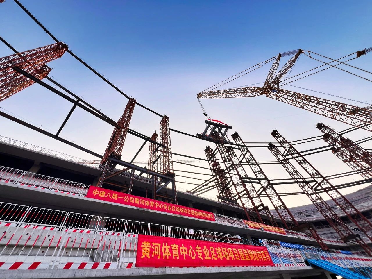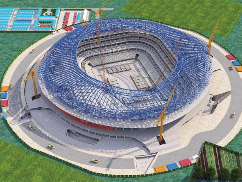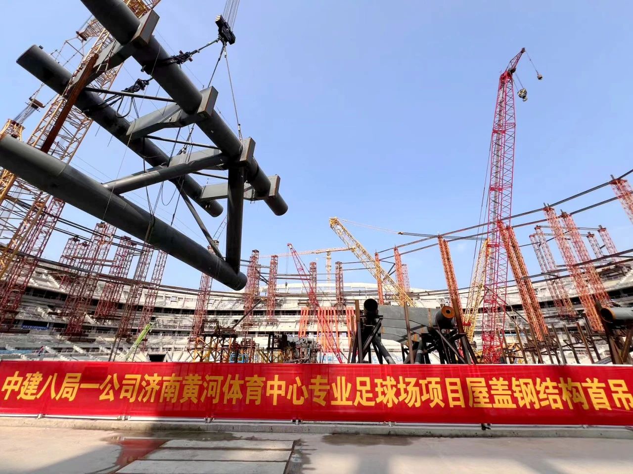 山東首個(gè)6萬(wàn)座專(zhuān)業(yè)足球場(chǎng)完成屋蓋鋼結(jié)構(gòu)首吊