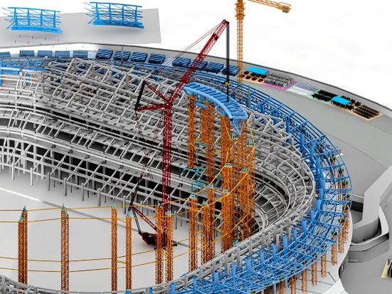 屋蓋鋼結(jié)構(gòu)共包含88榀桁架,單榀鋼桁架重約200噸,起吊高度超60米,相當(dāng)于將一頭成年藍(lán)鯨提升20層樓,且精度要求在5毫米以內(nèi),對(duì)于構(gòu)件強(qiáng)度與吊裝精度都提出了較大挑戰(zhàn)。項(xiàng)目聯(lián)合重慶大學(xué)周緒紅院士團(tuán)隊(duì),共同研發(fā)“大型復(fù)雜鋼結(jié)構(gòu)全過(guò)程一體化數(shù)字建造技術(shù)”,對(duì)吊裝段進(jìn)行激光掃描和視覺(jué)重建,基于點(diǎn)云數(shù)據(jù)智能處理算法,自動(dòng)生成多尺度尺寸檢測(cè)報(bào)告,并提前進(jìn)行相鄰節(jié)段的虛擬預(yù)拼裝,為后續(xù)節(jié)段的動(dòng)態(tài)糾偏提供數(shù)據(jù)支撐,全面提升場(chǎng)館建造品質(zhì)。
