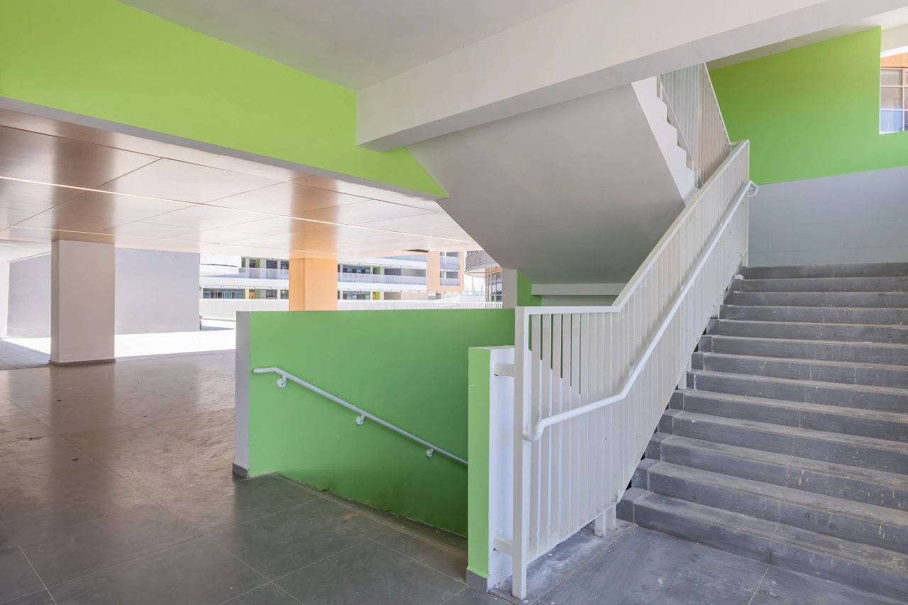 項目以“濱海森林”為設(shè)計概念,以“垂直群落”為設(shè)計主題,采用院落式布局教學(xué)樓裝飾色塊碰撞室內(nèi)外景色相映襯,光影交織每個角落,自成一幅風(fēng)景。