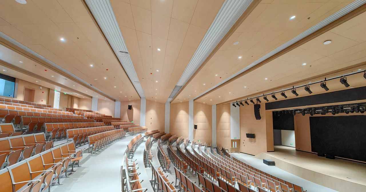 行政樓報告大廳大氣亮堂,可容納800多人,天花板和墻面采用吸音板和聲音反射、擴散材料,在增強隔音的同時提升室內(nèi)聲音傳播效果。