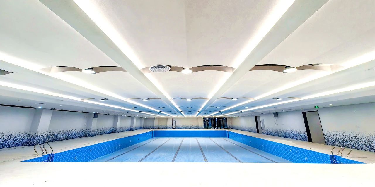 游泳館水池分淺水和深水區(qū),且采用專用防滑藍(lán)色地磚天花波浪造型的陶晶沙吸聲,板墻面藍(lán)白漸變的馬賽克配合泛光照明,使空間色彩動感多變,營造活力水上樂園的氛圍。