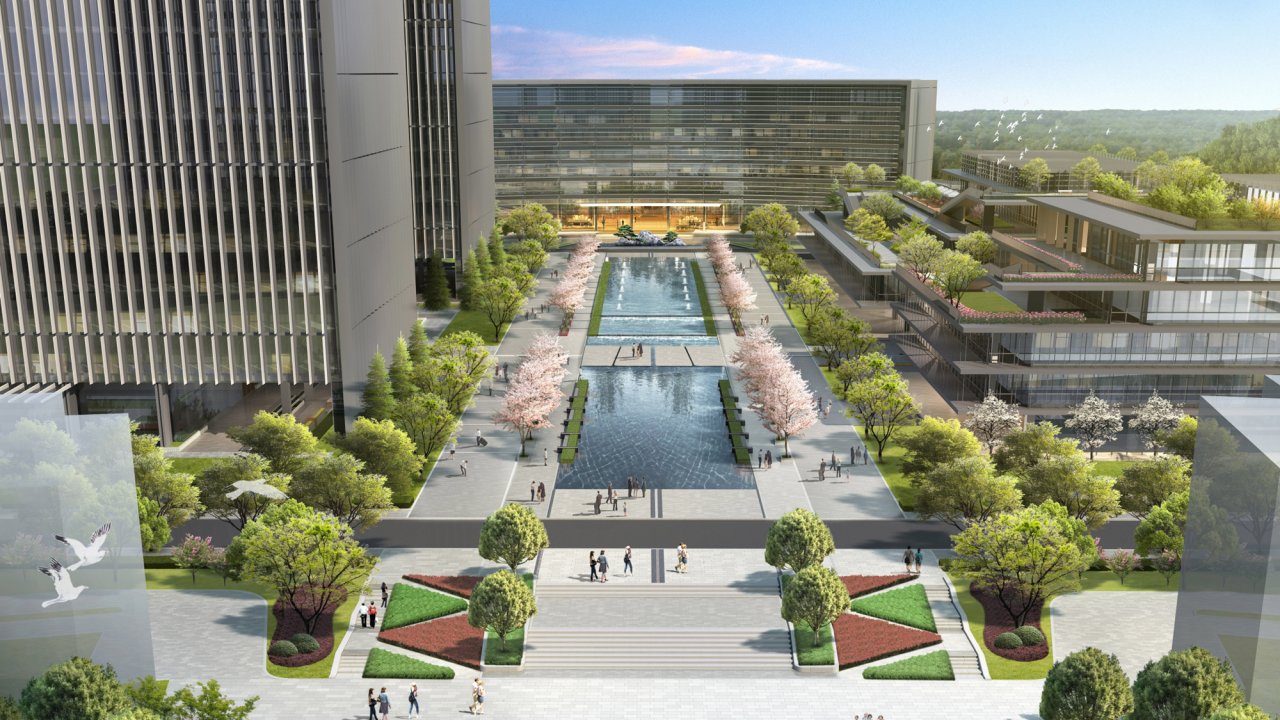 項目特別預留為科技攻關團隊使用的互通開間、協作共享的交流中心,為科研創(chuàng)新和頭腦風暴提供基礎環(huán)境,各具特色的休閑花園散布建筑周邊,通過慢行系統(tǒng)彼此連通屋頂花園,沿用線條流動的風格將場地分成種植空間與公共場地,便于員工在戶外活動。