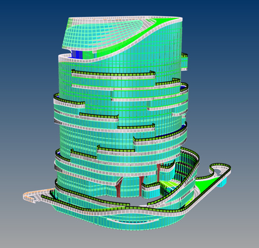 項(xiàng)目外圍為異型鋼結(jié)構(gòu)框架,鋼結(jié)構(gòu)節(jié)點(diǎn)猶如拼圖碎片,數(shù)量眾多且形狀各異,且弧形鋼構(gòu)在吊裝時(shí)穩(wěn)定性差,容易偏離預(yù)定角度位置。項(xiàng)目采用BIM技術(shù),模擬分析復(fù)雜鋼構(gòu)件的重心位置,從而確定合理的吊點(diǎn)位置和吊耳方向,確保安裝效率、準(zhǔn)確性和安全性。