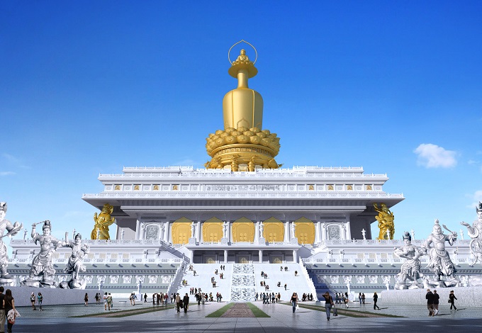 主體建筑雄偉、氣勢(shì)恢宏,金世尊安然屹立在城市之巔。從金碧輝煌的舍利金瓶、寓意國(guó)泰民安的天王護(hù)法,到氣勢(shì)如虹的靈光寶殿、吉時(shí)升起拋灑甘露的觀音水法,再到暗藏神秘地宮、出土珍奇國(guó)寶的千年古塔興隆塔,精美絕倫的現(xiàn)代藝術(shù)創(chuàng)作與莊嚴(yán)悠久的歷史積淀相互輝映。