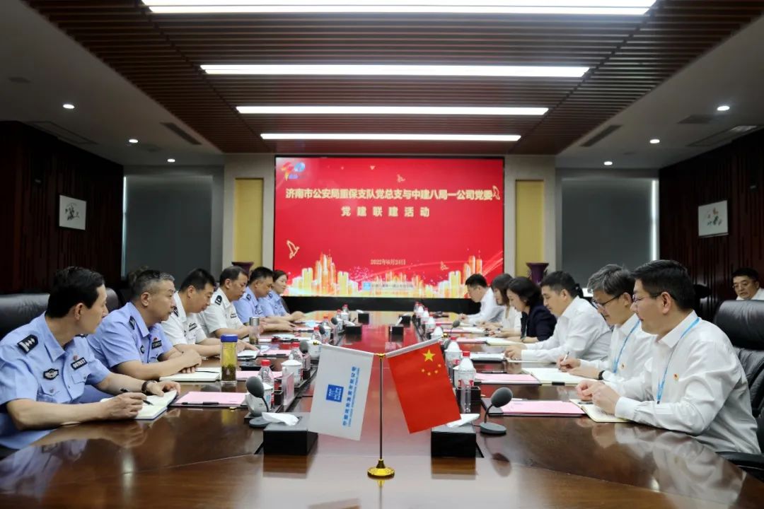 6月24日,濟(jì)南市公安局重點(diǎn)工程保衛(wèi)支隊(duì)黨總支書記、支隊(duì)長趙鋒,黨總支副書記、政委范勇一行到訪中建八局一公司總部,開展“黨旗飄揚(yáng) 重保先行 軍魂匠心 警企共建”黨建聯(lián)建活動(dòng)。公司黨委副書記、總經(jīng)理?;瘧棧o(jì)委書記徐紅志,黨委副書記、工會(huì)主席聶麗及相關(guān)負(fù)責(zé)人參加。